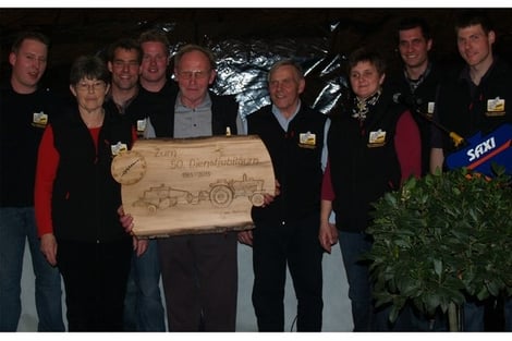 Franz, der X 100'000 Ballen gepresst, X 1'000 m3 Mais geerntet, X 100 ha Mais gesät, X 100 Silos zugefüllt und zahllose Ster Holz für die Firma zugefrässt hat, kann sein 50-jähriges Dienstjubiläum feiern. Wir gratulieren dir Franz.