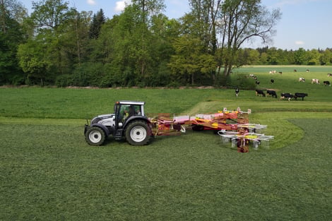Immer kürzere Schönwetterfenster, weniger Personal auf den Betrieben, und die enorme Schlagkraft unserer Feldhäcksler, bewegen uns 2019 dazu, in eine bis dato noch nie im Betrieb gesehene Maschine zu investieren. Ein Pöttinger 1252C 4-Kreisel-Schwader ergänzt unsere Erntekette.